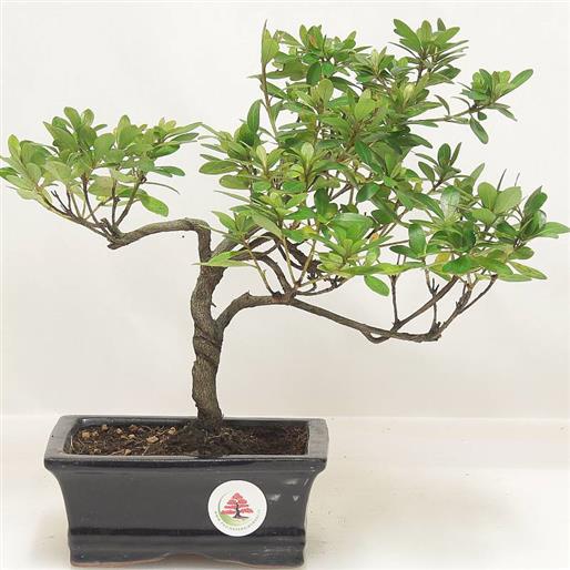 Rhododendron indicum (Ericacee) Arbusto sempreverde, originario del Giappone, con piccole foglie di un bel verde scuro. La peculiarità di questa essenza è la spettacolare fioritura primaverile, che ne fa una delle più belle piante da fiore in assoluto. L'Azalea, come tutte le Ericacee, ama essere annaffiata con acqua decalcificata; preferisce le posizioni ombreggiate (infatti il habitat ideale è il sottobosco di conifere) e si presta a tutti gli stili bonsai.
