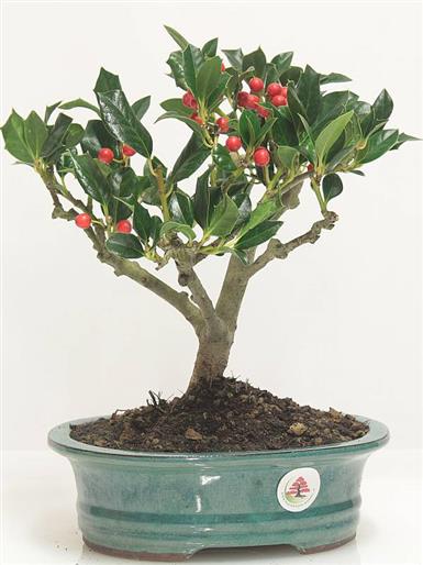 Ilex aquifolium (Aquifoliacee) Alberello sempreverde originario dell'Asia e dell'Europa, in natura raggiunge i 10 mt. di altezza. Le foglie sono coriacee, a margine spinoso, di un bel verde intenso. Produce fiorellini bianchi, ai quali seguono delle graziose bacche rosse. Vive bene al sole, o a mezz'ombra; d'inverno, nelle regioni del nord va riparato in serra fredda, mentre, nel resto d'Italia sopporta bene la stagione invernale. Bonsai di grande fascino e di facile coltivazione.