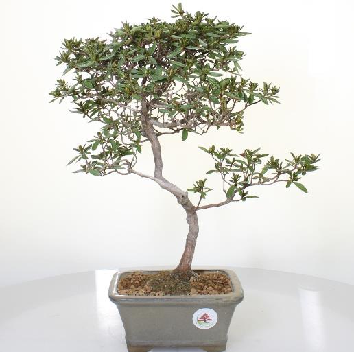Rhododendron satsuki kagayaki (Ericacee) Arbusto sempreverde, originario del Giappone, con foglie piccolissime di un bel verde scuro. La peculiarità di questa essenza è la spettacolare fioritura primaverile di colore viola acceso, che ne fa una delle più belle piante da fiore in assoluto. L'Azalea, come tutte le Ericacee, ama essere annaffiata con acqua decalcificata; preferisce le posizioni ombreggiate (infatti il habitat ideale è il sottobosco di conifere) e si presta a tutti gli stili bonsai.