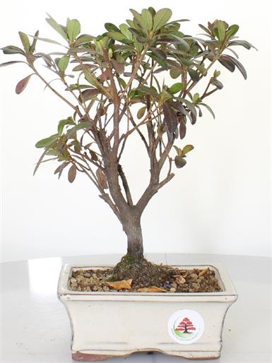Rhododendron indicum (Ericacee) Arbusto sempreverde, originario del Giappone, con piccole foglie di un bel verde scuro. La peculiarità di questa essenza è la spettacolare fioritura primaverile, che ne fa una delle più belle piante da fiore in assoluto. L'Azalea, come tutte le Ericacee, ama essere annaffiata con acqua decalcificata; preferisce le posizioni ombreggiate (infatti il habitat ideale è il sottobosco di conifere) e si presta a tutti gli stili bonsai.