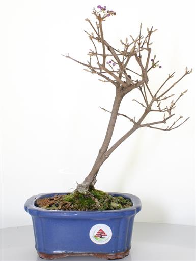 Callicarpa(Verbenacee) Arbusto originario dell'Asia e dell'America settentrionale, in natura cresce fino a 2-3 metri. Ben proporzionato, grazie al fogliame di piccole dimensioni, in estate produce dei graziosi fiori rosa e, successivamente, piccoli frutti lilla-viola che rimangono attaccati alla pianta anche dopo la caduta delle foglie, conferendo al bonsai un aspetto decisamente affascinante e singolare. Specie autofertile (s'impollina da sola).