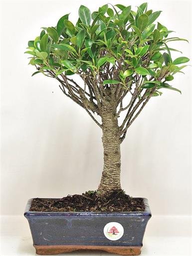 Albero di origine tropicale, dal tronco maculato, con foglie lucide e coriacee; particolarmente apprezzato per la possibilità di vivere anche all'interno, produce facilmente radici aeree che partono dai rami e, a volte, si ricopre di piccoli frutti. Il Ficus è un bonsai facile da mantenere e poco esigente riguardo le annaffiature e le concimazioni.